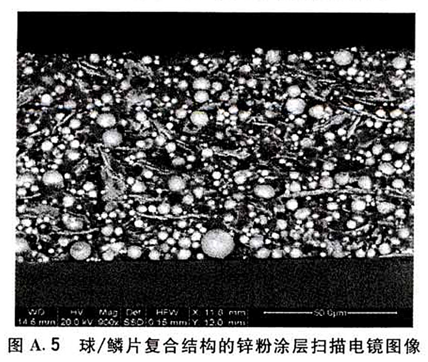 圖A.5  球/鱗片復(fù)合結(jié)構(gòu)的鋅粉涂層掃描電鏡圖像