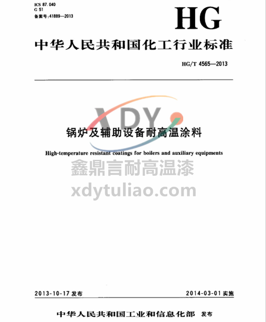 HG/T4565-2013鍋爐及輔助設備耐高溫涂料 備案號:41889-2013 中華人民共和國化工行業標準 HG/T4565-2013 鍋爐及輔助設備耐高溫涂料 High-temperature resistant coatings for boilers and auxiliary equipemts 2013-10-17發布 2014-03-01實施 中華人民共和國工業和信息化部 發布 本標