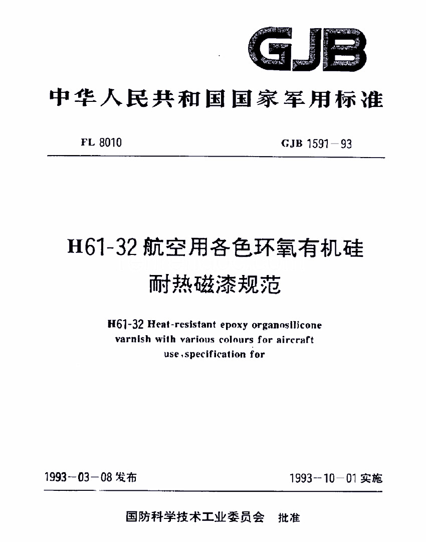 H61-32各色環氧有機硅耐熱磁漆標準GJB 1531- 93 GJB 中華人民共和國國家軍用標準 FL8010  GJB 1531- 93 H61- 32航空用各色環氧有機硅耐熱磁漆規范 H61-32 Heat-resistant epoxy organosilicnne vrnish with various colonrs fnraircrufl use speciflc
